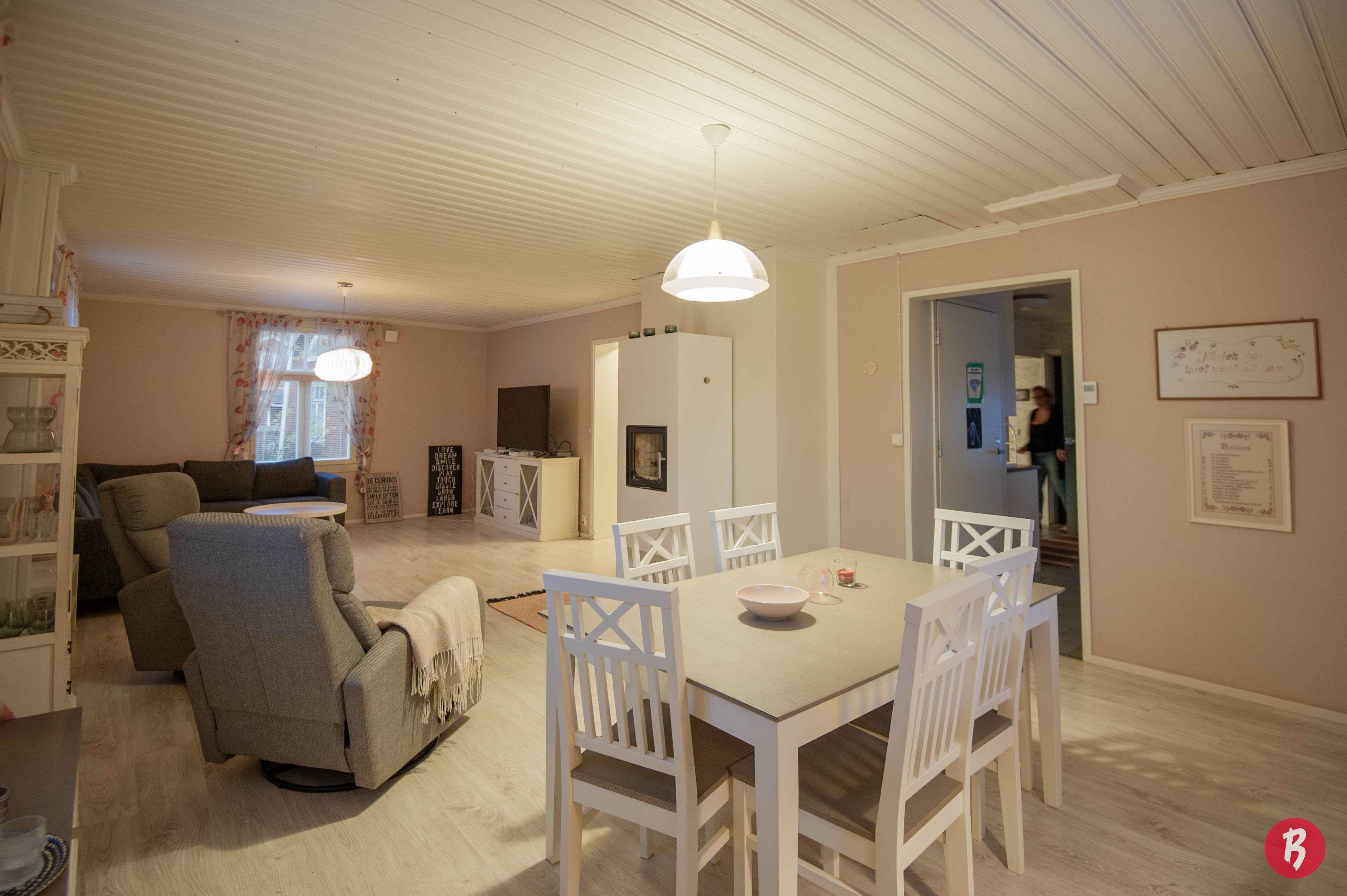 Bostadens 140 kvadratmeter ger gott om utrymme för både vardagsliv och gemenskap. De stora fönstren släpper in rikligt med naturligt ljus och skapar en känsla av rymd. Huset har fyra rum, ett kök, en bastu samt två toaletter, vilket gör det till ett idealiskt familjehem.